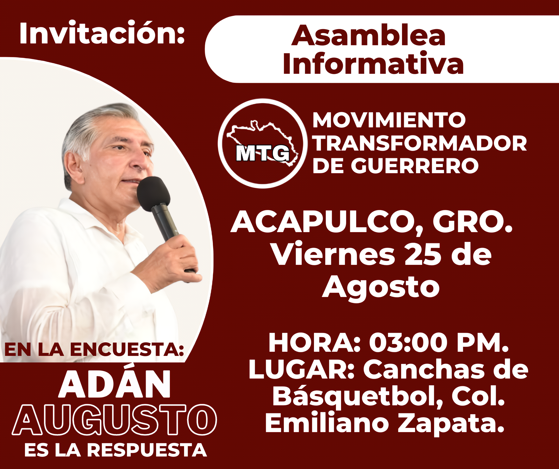 Atenta invitación a la Asamblea Informativa del Movimiento Transformador de Guerrero, este viernes 25 de agosto a las 3 pm en las canchas de básquetbol de la colonia Emiliano Zapata, en Acapulco, guerrero.