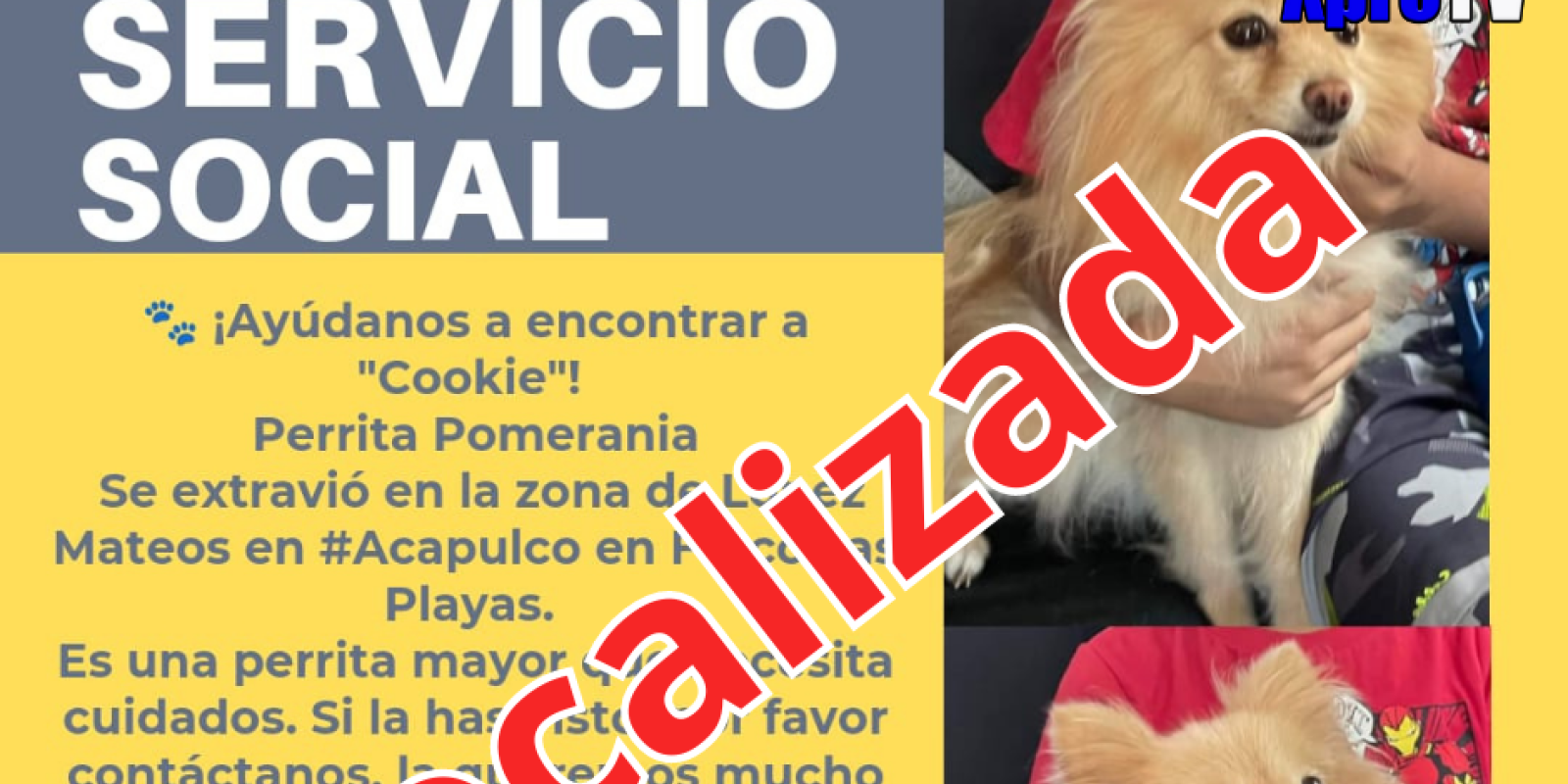 Exprésate Es localizada la perrita Cookie La perrita Cookie ya fue localizada🐶, gracias por tú apoyo. Por Kati Pinto, 30 Agosto, 2023 Tags #perros #serviciosocial #Acapulco Relacionadas Acapulco 🔵 Mañanera de la Presidenta Claudia Sheinbaum en Acapulco este viernes 09 de enero. Internacional Arribo del crucero Seven Seas Mariner a Acapulco Internacional Tianguis del Bienestar beneficia a casi 9 mil familias vulnerables en Acapulco Contenido Relacionado Exprésate Paola Longoria, campeona del Abierto de Boston 2025 Exprésate BLOQUEAN POR AGUA EN LA LAJA Exprésate La Fiscalía General del Estado de Guerrero, realiza investigaciones de gabinete y campo para la pronta localización de la menor Adillene “N”.
