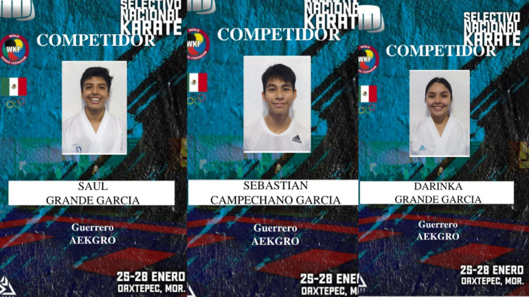 Los atletas acapulqueños Darinka Grande García, Saúl Grande García, Sebastián Campechano García y el zihuatanejense Guillermo Moreno Flores, todos ellos acompañados de su Coach Saúl Grande Daniel, viajarán a la ciudad de Oaxtepec del 25 al 28 de enero al Campeonato Nacional Selectivo de Karate.