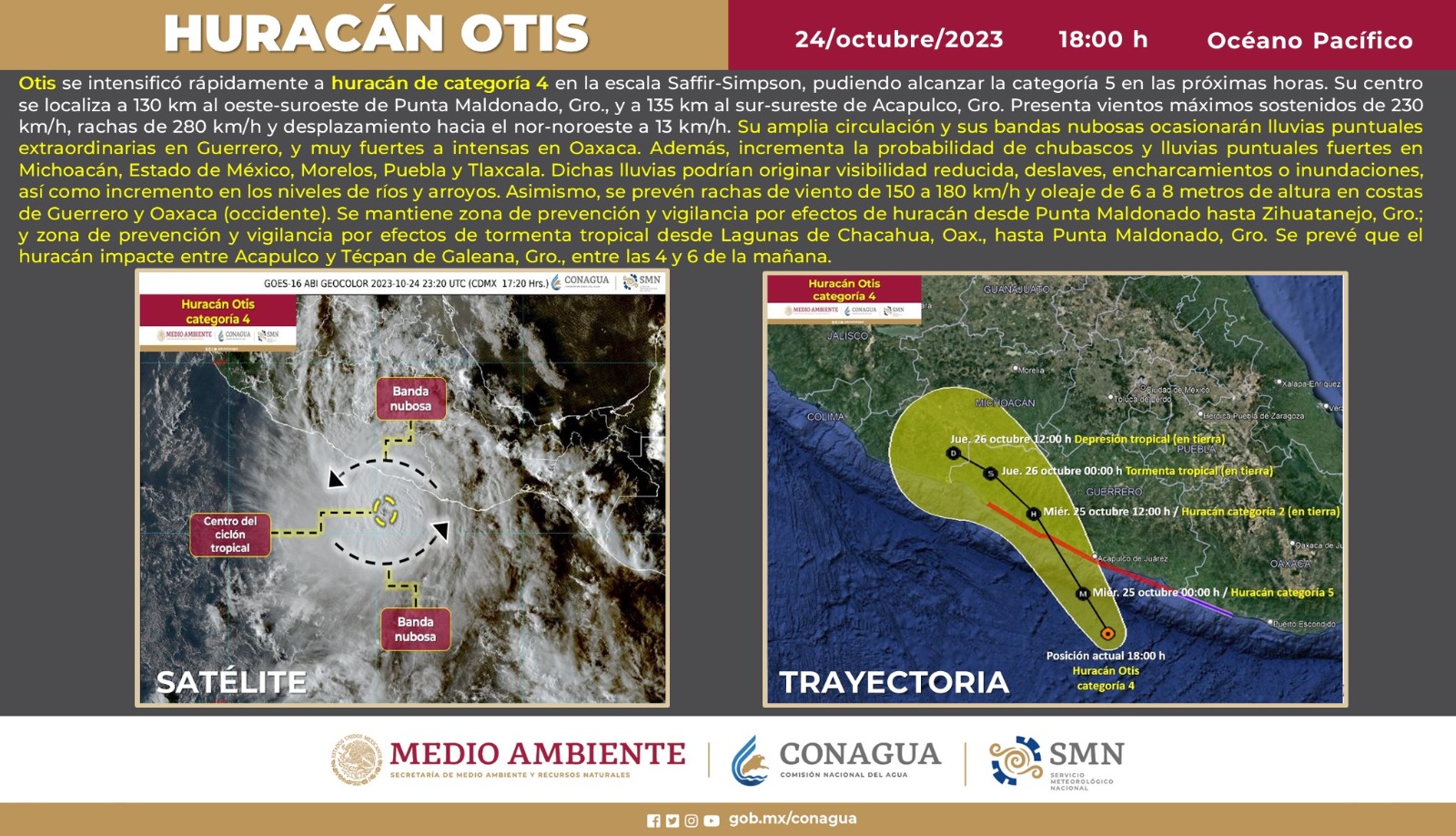 El Huracán se encuentra a 130 kilómetros al oeste-suroeste de Punta Maldonado, Oaxaca, y a 135 kilómetros al sur-sureste de Acapulco. Asimismo, el fenómeno presenta vientos máximos sostenidos de hasta 230 kilómetros por hora y oleaje de 6 a 8 metros de altura en costas de Guerrero.