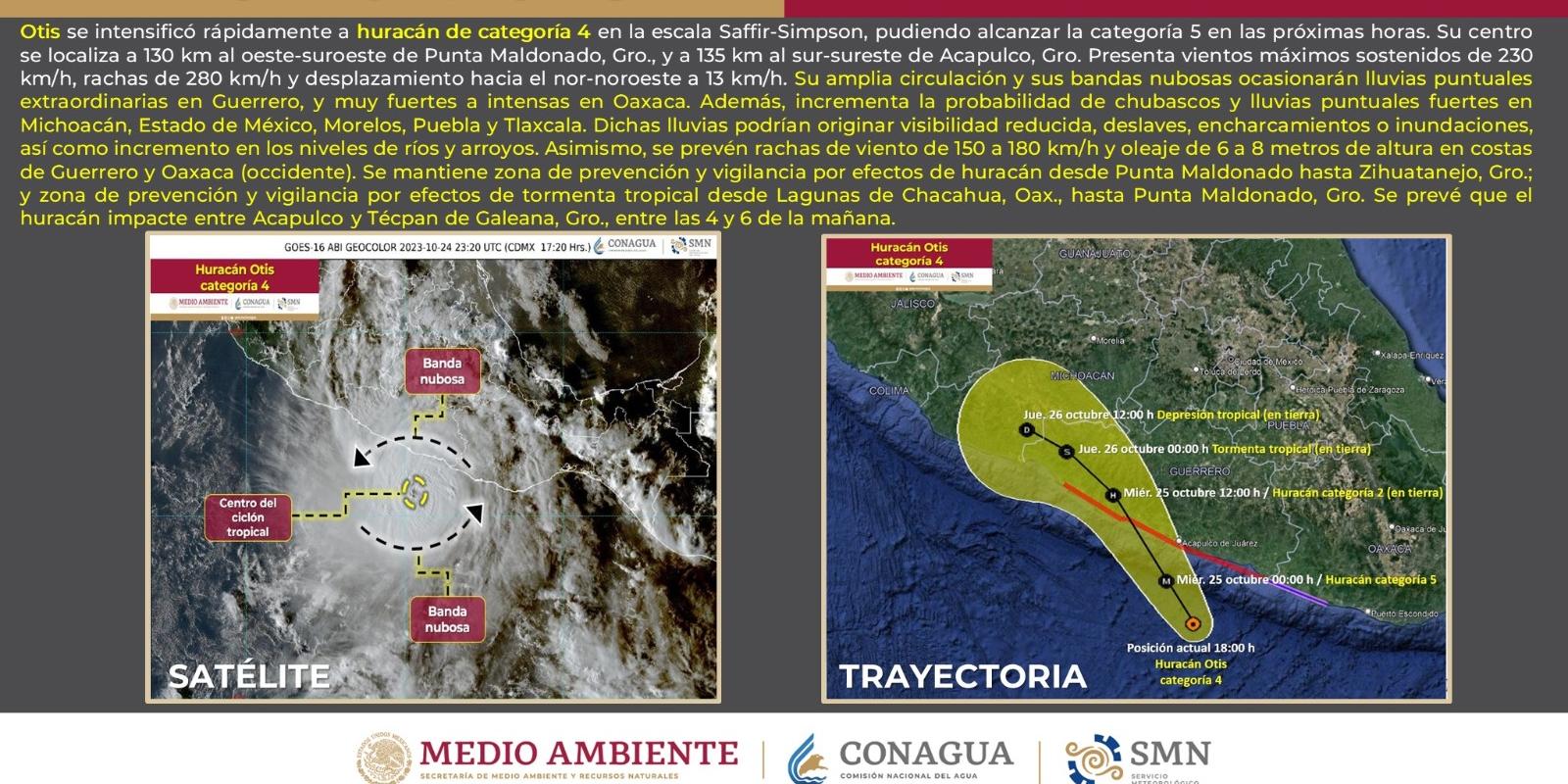 El reporte vespertino del Servicio Meteorológico Nacional (SMN) señala que el fenómeno se ha intensificado rápidamente a categoría 4 en la escala Saffir-Simpson, pudiendo alcanzar la categoría 5 en las próximas horas.